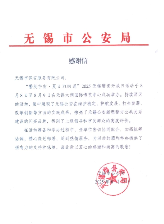 熱情服務,彰顯擔當 ——公司獲無錫市公安局感謝信